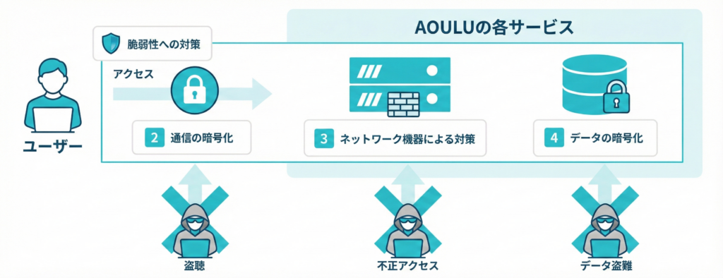 AOULUの各サービスでは、社内規定に基づき、ソフトウェアの脆弱性を解消するため、定期的なセキュリティパッチの適用と最新バージョンへのアップデートを継続的に実施しています。重要度の高い脆弱性が発見された場合は、緊急パッチ適用フローに基づき迅速に対応します。